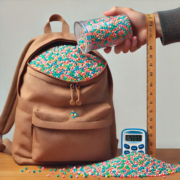 The bead-filling technique is considered one of the most accurate methods. It adapts to the backpack’s shape and fills every nook and cranny, representing its storage capacity.